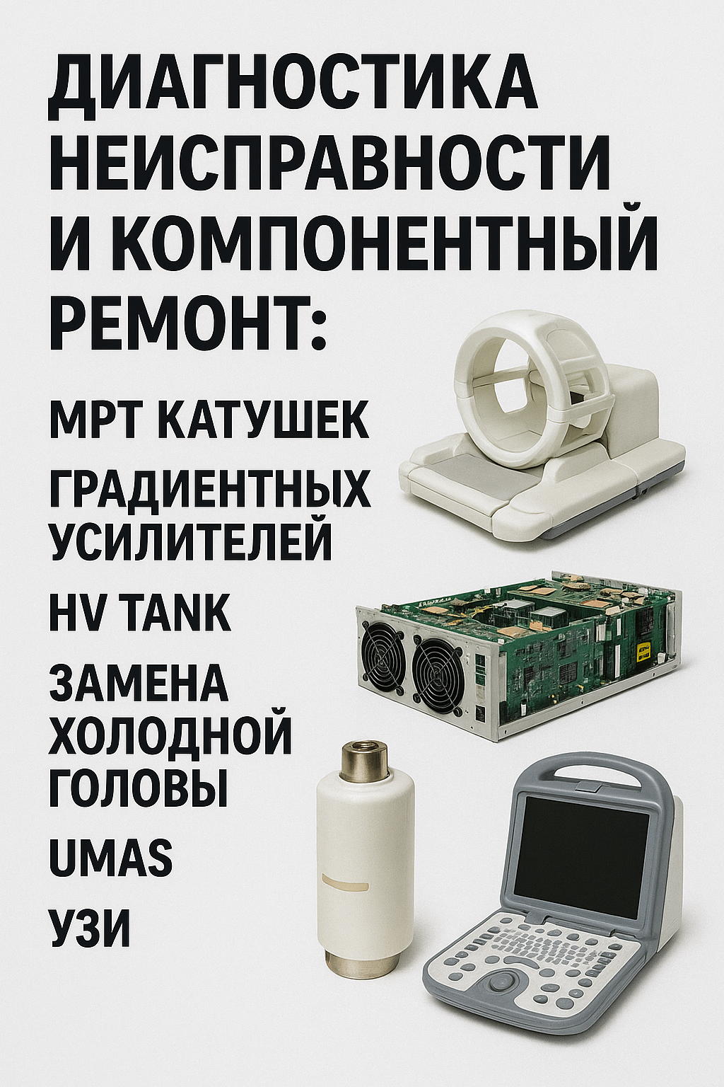 - Диагностика неисправности и компонентный ремонт: МРТ катушек, градиентных усилителей, HV TANK, замена холодной головы, UMAS, УЗИ